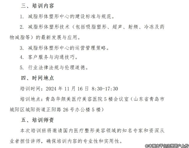 培訓(xùn)時(shí)間:2024年11月16日8:30-17:30培訓(xùn)地點(diǎn):青島華顏美醫(yī)療美容醫(yī)院5樓會(huì)議室(山東省青島市城陽區(qū)城陽街道正陽路 26 號(hào)辦公樓5樓)五、培訓(xùn)師資