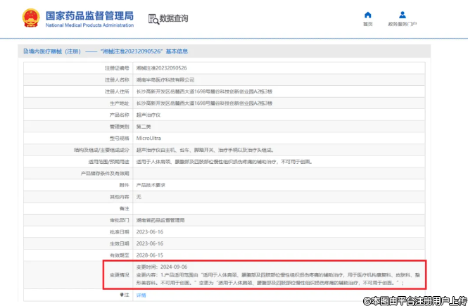近日,國家藥品監(jiān)督管理局(NMPA)上湖南省內(nèi)7家企業(yè)的超聲治療儀注冊證進行了重要調(diào)整,統(tǒng)一取消了這些設(shè)備原本適用于“醫(yī)療機構(gòu)康復(fù)科、皮膚科、整形美容科、婦產(chǎn)科相關(guān)疾病的輔助治療”的標(biāo)注,明確限定了其僅適用于“人體肩頸、腰腹部及四肢部位慢性組織損傷疼痛,皮膚瘢痕和神經(jīng)性皮炎的輔助治療,以及促進產(chǎn)后子宮復(fù)舊”。