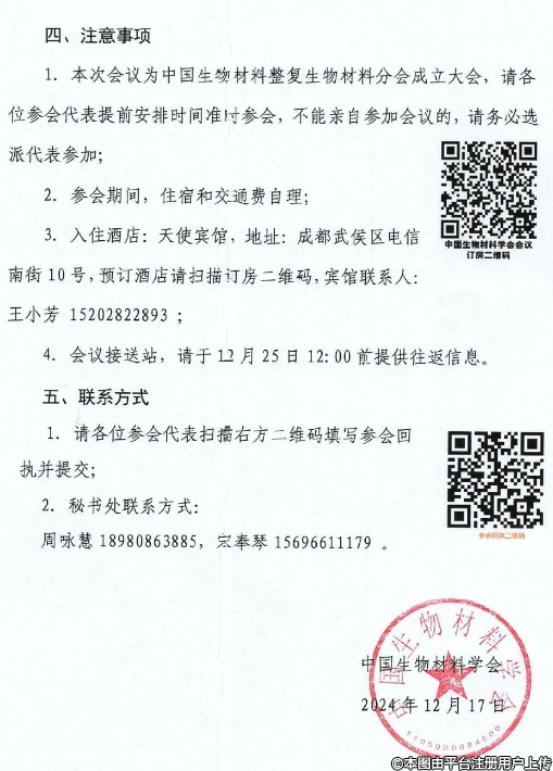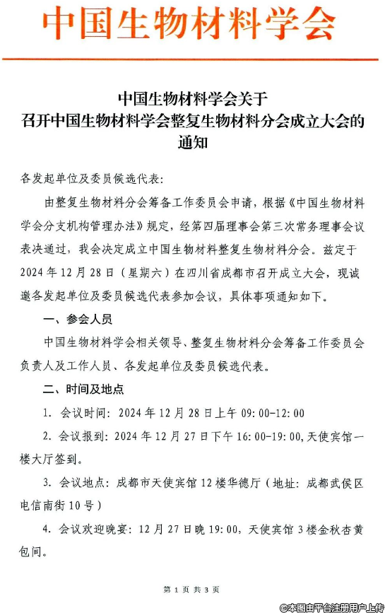 由整復(fù)生物材料分會(huì)籌備工作委員會(huì)申請(qǐng),根據(jù)《中國(guó)生物材料學(xué)會(huì)分支機(jī)構(gòu)管理辦法》規(guī)定,經(jīng)第四屆理事會(huì)第三次常務(wù)理事會(huì)議表決通過(guò),我會(huì)決定成立中國(guó)生物材料整復(fù)生物材料分會(huì)。茲定于2024年12月28日(星期六)在四川省成都市召開(kāi)成立大會(huì),現(xiàn)誠(chéng)邀各發(fā)起單位及委員候選代表參加會(huì)議,具體事項(xiàng)通知如下,