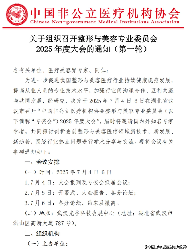 為進一步促進我國整形與美容醫(yī)療行業(yè)持續(xù)健康規(guī)范發(fā)展,提高從業(yè)人員的專業(yè)技術水平,加強行業(yè)間溝通合作、互利共贏與共同發(fā)展,經(jīng)研究,決定于2025年7月4日-6日在湖北省武漢市召開“中國非公立醫(yī)療機構協(xié)會整形與美容專業(yè)委員會(以下簡稱“專委會”)2025 年度大會”。屆時將邀請國內(nèi)外知名專家學者,共同探討剖析當前整形與美容醫(yī)療領域新技術、新發(fā)展新趨勢,圍繞行業(yè)熱點問題進行學術分享與交流?,F(xiàn)將會議有關事項通知如下: