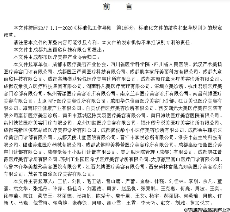 該規(guī)范由成都九章麗欣科技有限公司提出,成都市醫(yī)療美容產業(yè)協會歸口,并聯合四川省醫(yī)學科學院·四川省人民醫(yī)院、武漢嚴術美揚醫(yī)療美容門診有限公司、成都醫(yī)正嚴詞醫(yī)療科技有限公司、成都肌本演繹美麗科技有限公司、成都九章麗欣科技有限公司、成都高新漾膚輕悅醫(yī)療美容診所有限公司、成都高新序章醫(yī)療美容診所有限公司等多家單位共同起草。其起草過程嚴格遵循 GB/T 1.1—2020《標準化工作導則 第 1 部分:標準化文件的結構和起草規(guī)則》的規(guī)定,凝聚了眾多業(yè)內權威專家的專業(yè)智慧與豐富經驗,全面涵蓋了術后修復等全流程的細致準則。