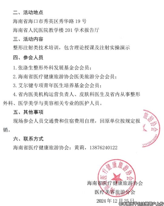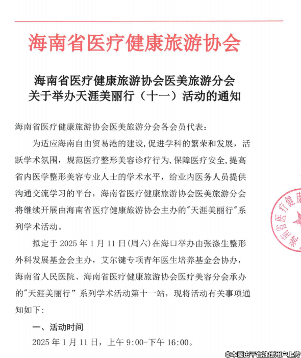 擬定于2025年1月11日(周六)在??谂e辦由張滌生整形外科發(fā)展基金會主辦,艾爾鍵專項青年醫(yī)生培養(yǎng)基金會協(xié)辦海南省人民醫(yī)院、海南省醫(yī)療健康旅游協(xié)會醫(yī)療美容分會承辦的"天涯美麗行”系列學術(shù)活動第十一站,現(xiàn)將活動有關(guān)事項通知如下: