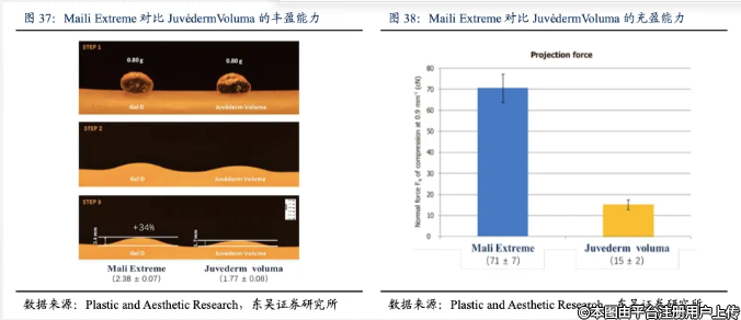 根據(jù)Plastic and Aesthetic Research和東吳證券研究所報(bào)告,在與艾爾健喬雅登品牌的Juvéderm Voluma的對比試驗(yàn)中,應(yīng)用OxiFree?專利技術(shù)的透明質(zhì)酸凝膠產(chǎn)品MaiLi?Extreme的豐盈程度高出34%,與此同時MaiLi?Extreme所需注射的凝膠減少了24%。