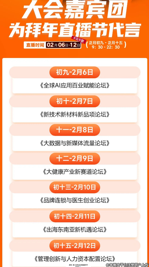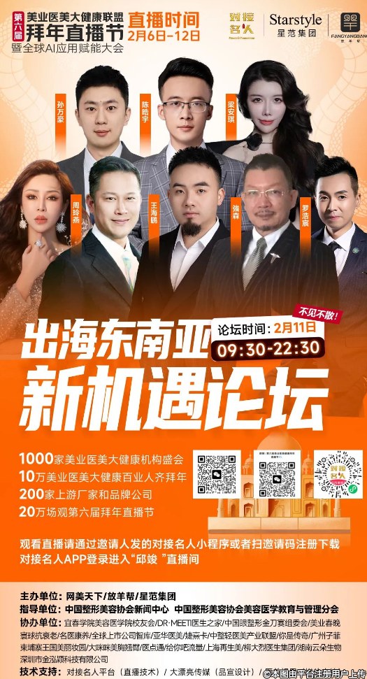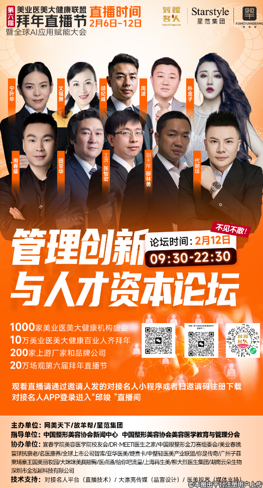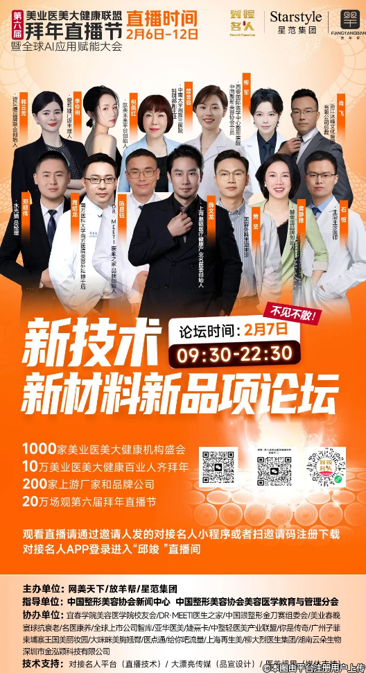 第六屆美業(yè)醫(yī)美大健康聯(lián)盟拜年直播節(jié)從2月6日(正月初九)持續(xù)至2月12日(正月十五),期間設置七大創(chuàng)新論壇,每日聚焦不同前沿主題。