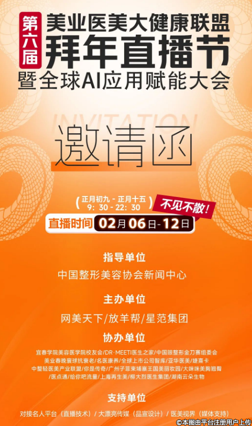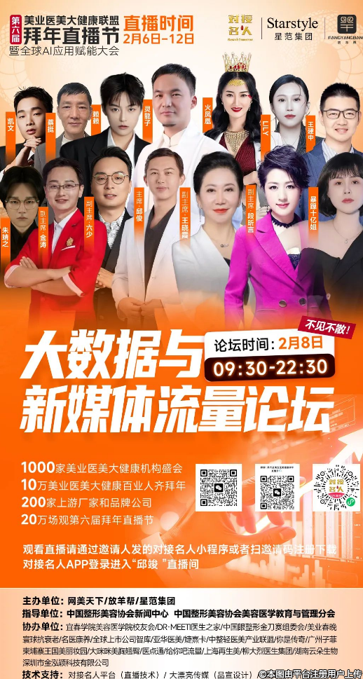 為期七天的第六屆美業(yè)醫(yī)美大健康聯(lián)盟拜年直播節(jié)暨全球AI應用賦能大會將于2月6日~2月12日(正月初九至正月十五)在對接名人平臺的直播間舉辦。本次大會在美業(yè)、醫(yī)美和大健康領域掀起了一場創(chuàng)新與交流的熱潮,將吸引行業(yè)內(nèi)眾多專業(yè)人士和機構的積極參與。