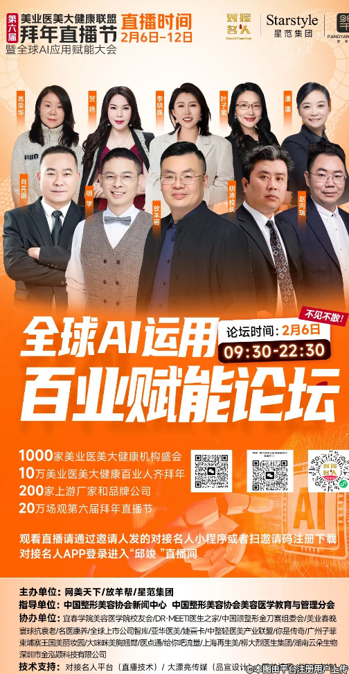 2月6日正月初九的“全球AI應用百業(yè)賦能論壇”(主席:放羊哥、副主席:胡濤),率先探討AI技術為美業(yè)、醫(yī)美和大健康領域及百業(yè)帶來的變革與機遇,開啟智能化發(fā)展新篇章;