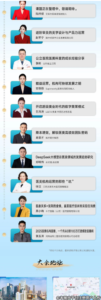 2025.3.28-30第六屆整形大典-醫(yī)學(xué)美容學(xué)術(shù)交流大會(huì)將要在美麗的青島隆重召開,全國醫(yī)美行業(yè)資深專家、獲獎(jiǎng)專家、整形大典全國醫(yī)學(xué)編委及眾多知名企業(yè)家歡聚一堂,共襄盛舉。