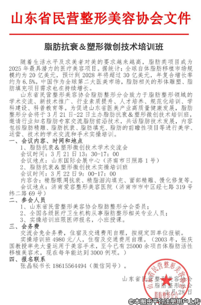 山東省民營整形美容協(xié)會脂肪整形分會致力于脂肪整形領(lǐng)域的學術(shù)交流、新技術(shù)推廣、行業(yè)素質(zhì)提升、人才培養(yǎng)、規(guī)范化培訓(xùn)、學科建設(shè)、科普教育等。為促進山東省醫(yī)美產(chǎn)業(yè)高質(zhì)量健康發(fā)展,脂肪整形分會將于3月21日-22日主辦脂肪抗衰&塑形微創(chuàng)技術(shù)培訓(xùn)班,邀請行業(yè)知名脂肪專家交流脂肪前沿技術(shù),共話脂肪技術(shù)發(fā)展,內(nèi)容包括脂肪精雕、脂肪抗衰、脂肪填充、脂肪的前瞻性項目等進行美學運營、技術(shù)的學術(shù)交流和手術(shù)實操培訓(xùn)。