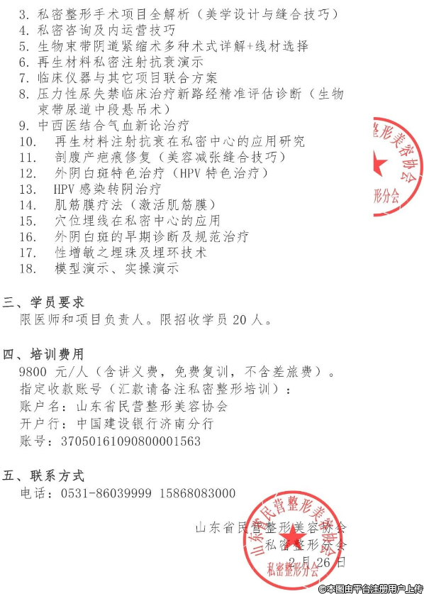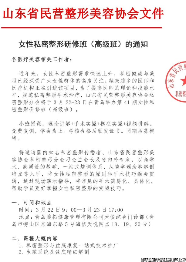第41期女性私密整形研修班(高級(jí)班)將于3月22-23日在青島舉辦