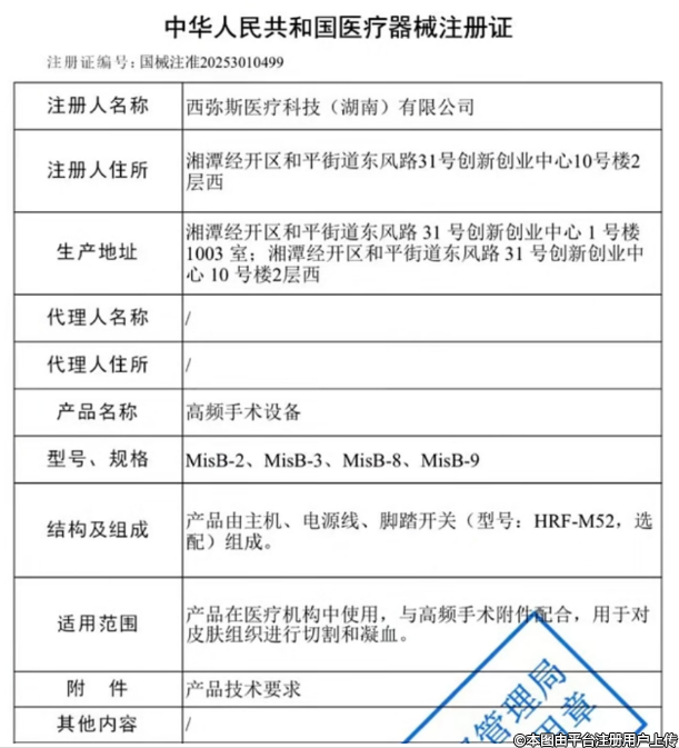 根據(jù)國(guó)家藥監(jiān)局《2025年03月06日醫(yī)療器械批準(zhǔn)證明文件送達(dá)信息》顯示,西彌斯旗下“高頻手術(shù)設(shè)備”獲得批準(zhǔn)。注冊(cè)編號(hào):國(guó)械注準(zhǔn)20253010499;適用范圍為:產(chǎn)品在醫(yī)療機(jī)構(gòu)中使用,與高頻手術(shù)附件配合,用于對(duì)皮膚組織進(jìn)行切割和凝血。