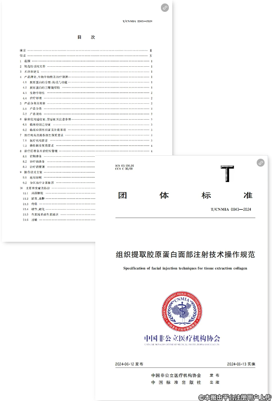 膠原蛋白注射市場快速增長,其應用范圍日益拓展,需要臨床操作加快標準化進程?;诖吮尘?,2024年7月,《組織提取膠原蛋白面部注射技術(shù)操作規(guī)范》團體標準(T/CNMIA 0043-2024)正式發(fā)布(以下簡稱“團體標準”),成為行業(yè)內(nèi)首個針對提取膠原蛋白面部注射技術(shù)的權(quán)威指南,標志著注射膠原蛋白行業(yè)進入標準化發(fā)展階段。