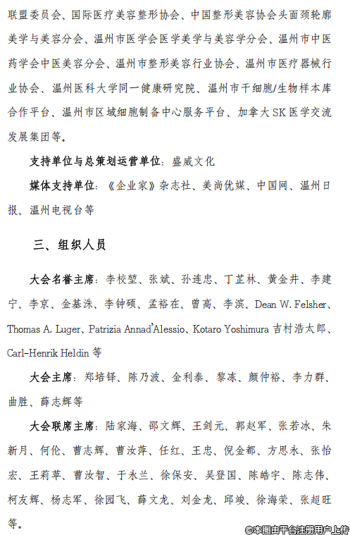 協(xié)辦單位:中國生物工程學(xué)會、中國國際商會絲路工委會、上合國家數(shù)字醫(yī)學(xué)發(fā)展中心工作委員會、世界內(nèi)鏡醫(yī)師協(xié)會中國整形外科聯(lián)盟委員會、國際醫(yī)療美容整形協(xié)會、中國整形美容協(xié)會頭面頸輪美學(xué)與美容分會、溫州市醫(yī)學(xué)會醫(yī)學(xué)美學(xué)與美容學(xué)分會、溫州市中醫(yī)藥學(xué)會中醫(yī)美容分會、溫州市整形美容行業(yè)協(xié)會、溫州市醫(yī)療器械行業(yè)協(xié)會、溫州醫(yī)科大學(xué)同一健康研究院、溫州市千細胞/生物樣本庫合作平臺、溫州市區(qū)域細胞制備中心服務(wù)平臺、加拿大SK醫(yī)學(xué)交流發(fā)展集團等,