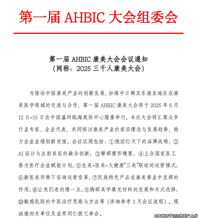 為推動中國康美產(chǎn)業(yè)的創(chuàng)新發(fā)展,加強中日韓及東南亞地區(qū)在康美醫(yī)學(xué)領(lǐng)域的交流與合作,第一屆 AHBIC 康美大會將于2025 年6月12 日-15 日在中國溫州甌海奧體中心隆重舉行。本次大會將匯聚眾多行業(yè)專家、企業(yè)代表,共同探討康美產(chǎn)業(yè)的前沿理念與發(fā)展趨勢,助力企業(yè)業(yè)績創(chuàng)新突圍。會議議題包括:①抱團打天下的品牌戰(zhàn)略;②AI設(shè)計與注射美容的融合創(chuàng)新;③臀部塑形精要:4上合國家醫(yī)工委為醫(yī)療企業(yè)賦能計劃:⑤生美-醫(yī)美-大健康“三美”聯(lián)動的運營模式:⑥新醫(yī)美形勢下咨詢運營變革;⑦民族特色產(chǎn)品在康美事業(yè)中發(fā)揮的作用;⑧讓我們老的慢一點;⑨胸部美學(xué)填充材料的發(fā)展和術(shù)式選擇⑩敏感肌膚的中醫(yī)治療思路與方法等(詳細參考3天會議流程)。現(xiàn)誠邀相關(guān)單位及業(yè)界同仁撥冗參會。