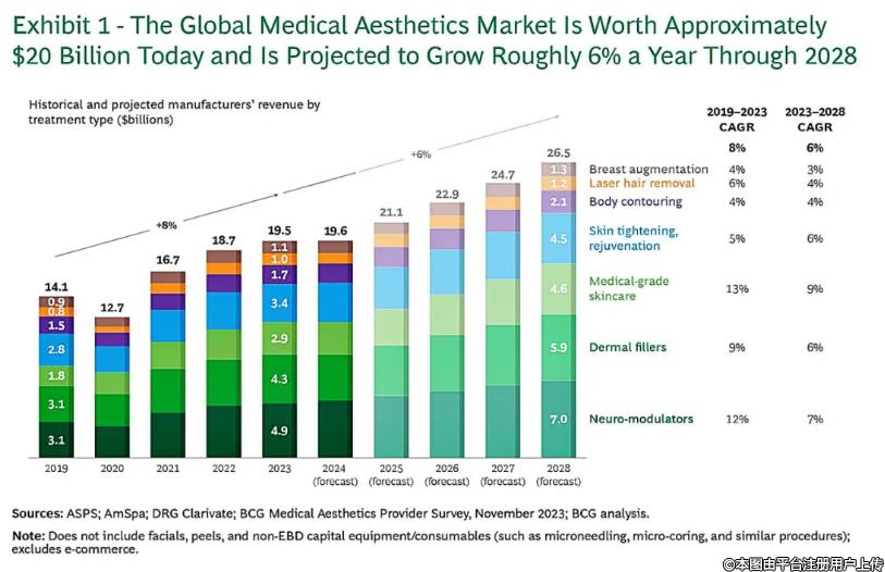 圖1. 目前全球醫(yī)美市場價值約200億美元,預計到2028年每年增長約6%。