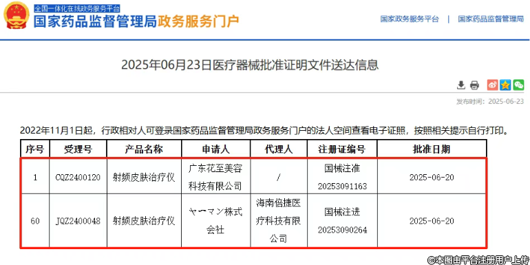 近日,國家藥品監(jiān)督管理局(NMPA)發(fā)布最新醫(yī)療器械批準(zhǔn)信息,兩款射頻皮膚治療儀正式獲批Ⅲ類醫(yī)療器械認(rèn)證,標(biāo)志著中國醫(yī)美器械領(lǐng)域再迎技術(shù)突破。此次獲批的產(chǎn)品分別來自廣東花至美容科技有限公司和ャ一マン株式會社(海南倍捷醫(yī)療科技有限公司代理),將進(jìn)一步豐富國內(nèi)合規(guī)醫(yī)美器械市場選擇,推動行業(yè)規(guī)范化發(fā)展。