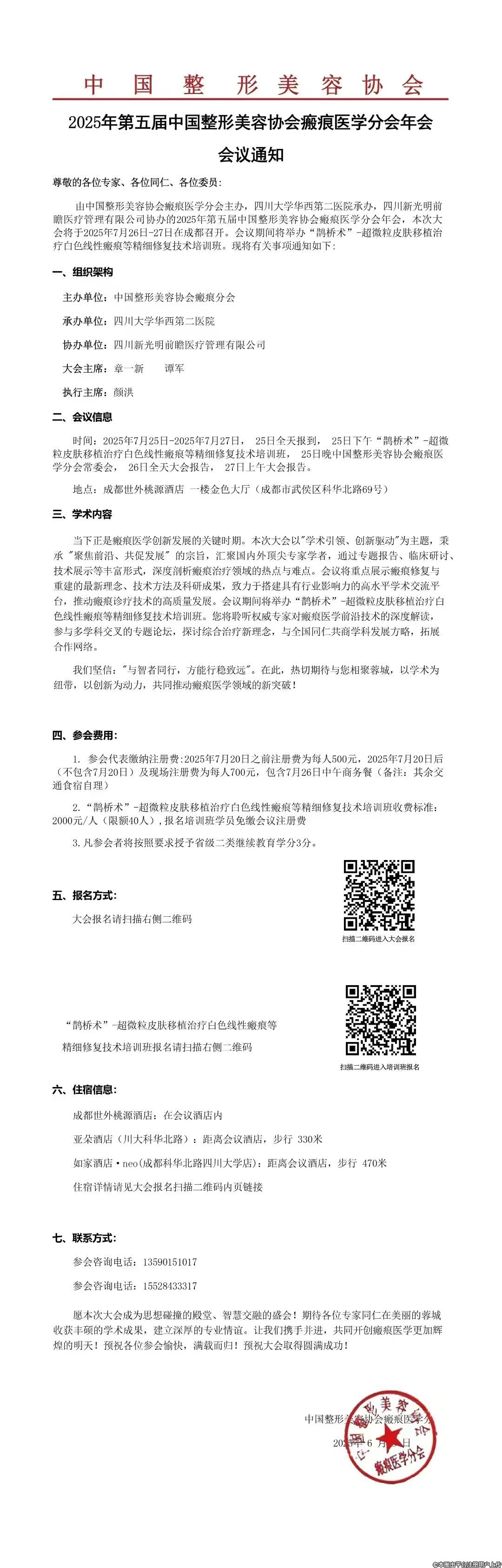 2025年第五屆中國整形美容協(xié)會瘢痕醫(yī)學分會年會即將召開