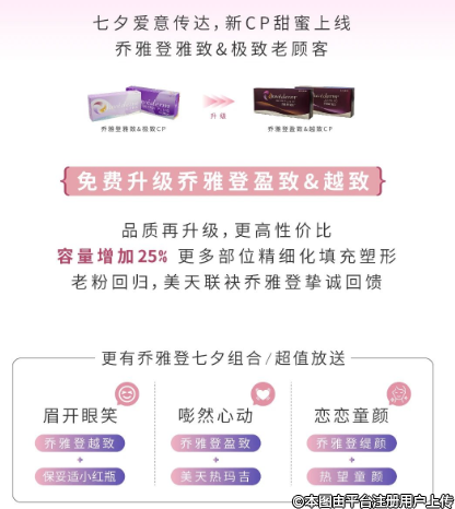 七夕喬雅登家族再添新CP,是心動(dòng)啊!免費(fèi)升級(jí)體驗(yàn)。品質(zhì)再升級(jí),更高性價(jià)比容量增加25%更多部位精細(xì)化填充塑形老粉回歸,大連美天聯(lián)袂喬雅登摯誠(chéng)回饋。