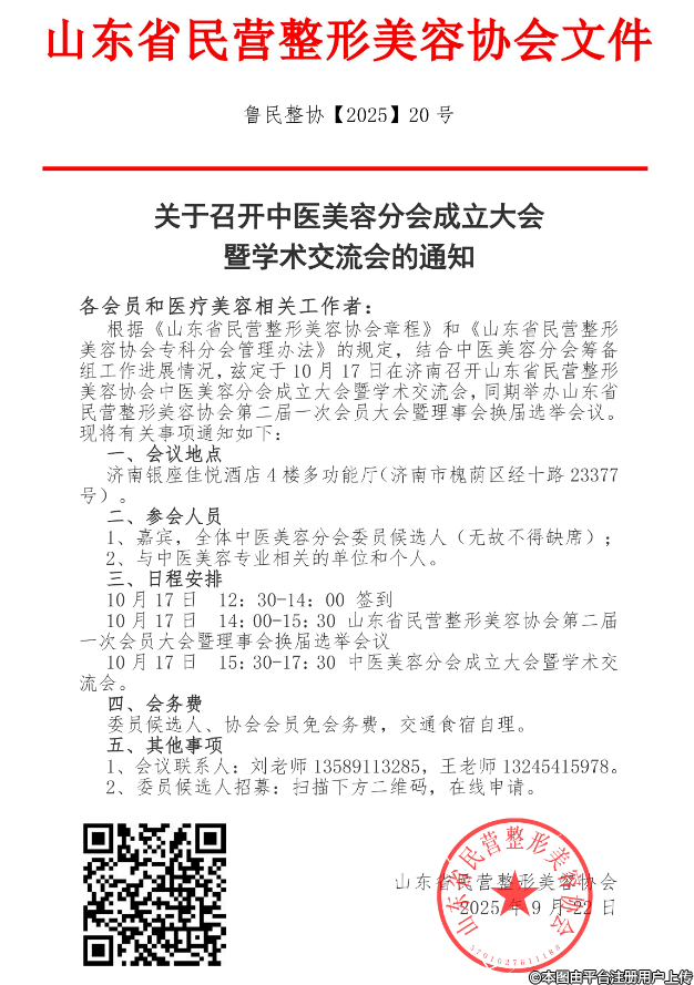 10月17日 14:00-15:30 山東省民營整形美容協(xié)會(huì)第二屆一次會(huì)員大會(huì)暨理事會(huì)換屆選舉會(huì)議