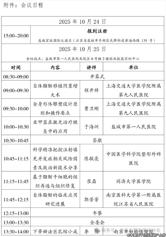 1、會議同期召開江蘇省整形美容協(xié)會脂肪醫(yī)學(xué)分會第一屆二次全委會,江蘇省整形美容協(xié)會脂肪醫(yī)學(xué)分會委員請務(wù)必到會。