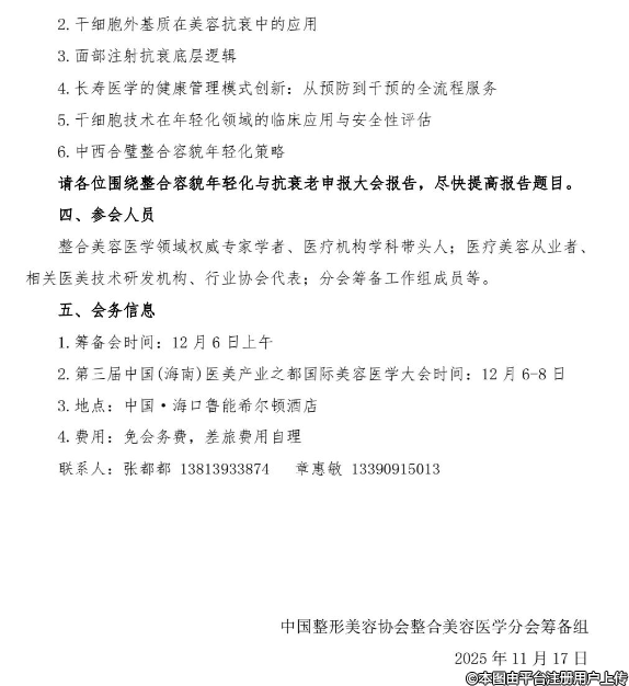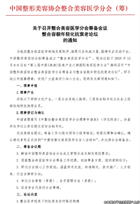 “中國整形美容協(xié)會(huì)整合美容醫(yī)學(xué)分會(huì)籌備會(huì)暨整合容貌年輕化抗衰老論壇”——本次活動(dòng)是中國醫(yī)學(xué)多學(xué)科整合趨勢(shì),匯聚醫(yī)美領(lǐng)域?qū)<遗c同仁,一方面研討整合美容醫(yī)學(xué)分會(huì)的建設(shè)規(guī)劃、行業(yè)標(biāo)準(zhǔn)制定及人才培養(yǎng)等核心議題,另一方面圍繞容貌年輕化與抗衰老領(lǐng)域的前沿技術(shù)、臨床實(shí)踐、安全規(guī)范展開交流。