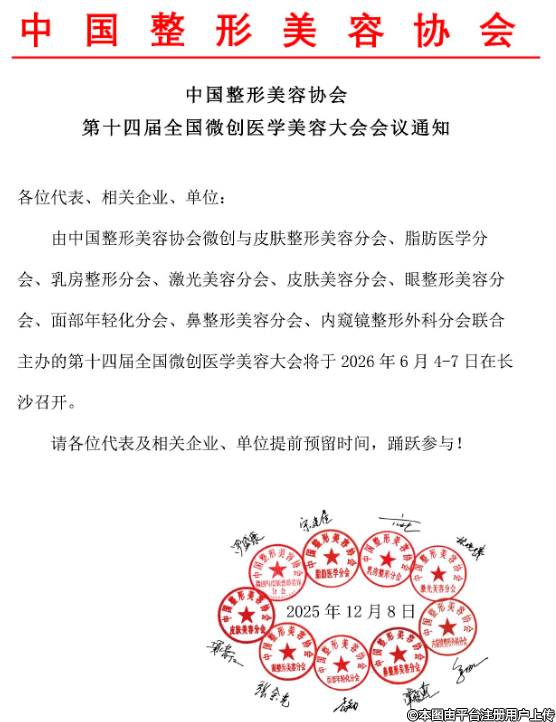 由中國(guó)整形美容協(xié)會(huì)微創(chuàng)與皮膚整形美容分會(huì)、脂肪醫(yī)學(xué)分會(huì)、乳房整形分會(huì)、激光美容分會(huì)、皮膚美容分會(huì)、眼整形美容分會(huì)、面部年輕化分會(huì)、鼻整形美容分會(huì)、內(nèi)窺鏡整形外科分會(huì)聯(lián)合主辦的第十四屆全國(guó)微創(chuàng)醫(yī)學(xué)美容大會(huì)將于2026年6月4-7日在長(zhǎng)沙召開。