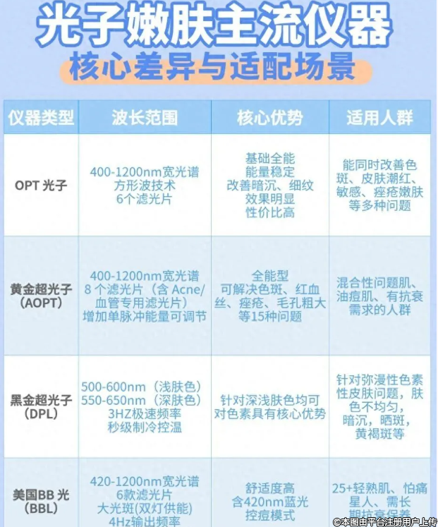 市場(chǎng)上光子嫩膚儀器五花八門,黃金超光子、黑金超光子、鉑金超光子、BB光等讓人眼花繚亂,其實(shí)不同儀器的核心優(yōu)勢(shì)和適用人群差異明顯,無需盲目追求高價(jià),精準(zhǔn)匹配需求才是關(guān)鍵。針對(duì)消費(fèi)者最關(guān)心的儀器選型問題,下面拆解了主流儀器的核心差異與適配場(chǎng)景: