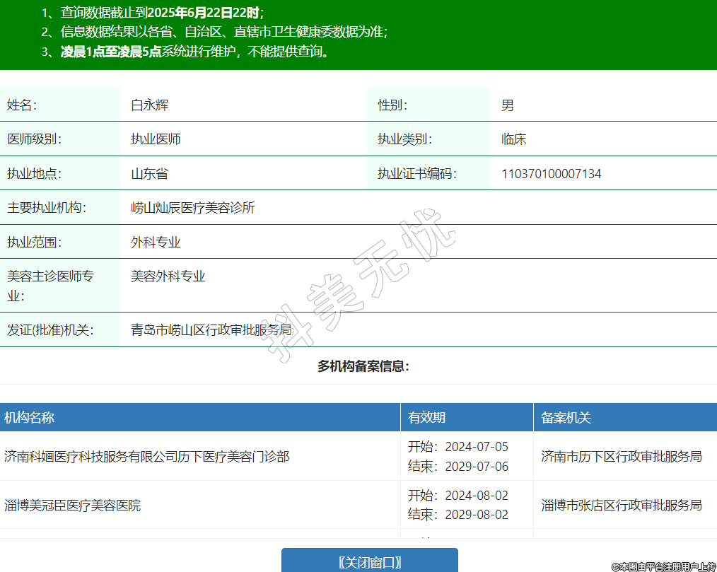姓名:白永輝性別:男醫(yī)師級別:執(zhí)業(yè)醫(yī)師執(zhí)業(yè)類別:臨床執(zhí)業(yè)地點:山東省執(zhí)業(yè)證書編碼:110370100007134主要執(zhí)業(yè)機構:嶗山燦辰醫(yī)療美容診所執(zhí)業(yè)范圍:外科專業(yè)美容主診醫(yī)師專業(yè):美容外科專業(yè)發(fā)證(批準)機關:青島市嶗山區(qū)行政審批服務局多機構備案信息:機構名稱 有效期 備案機關 濟南科婳醫(yī)療科技服務有限公司歷下醫(yī)療美容門診部 開始:2024-07-05結束:2029-07-06濟南市歷下區(qū)行政審批服務局 淄博美冠臣醫(yī)療美容醫(yī)院 開始:2024-08-02結束:2029-08-02淄博市張店區(qū)行政審批服務局 華美創(chuàng)和醫(yī)療美容(濟南)有限公司華美創(chuàng)和醫(yī)療美容門診部 開始:2024-08-05結束:2029-08-06濟南市市中區(qū)衛(wèi)生健康局 -