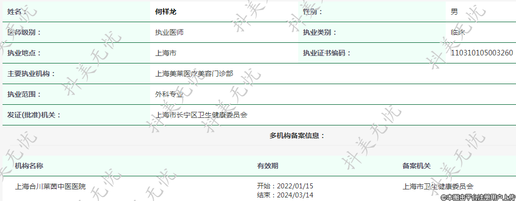 主要執(zhí)業(yè)機(jī)構(gòu):上海美萊醫(yī)療美容門診部