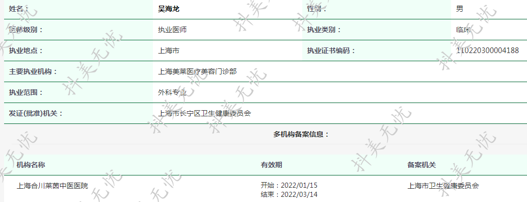 主要執(zhí)業(yè)機(jī)構(gòu):上海美萊醫(yī)療美容門診部