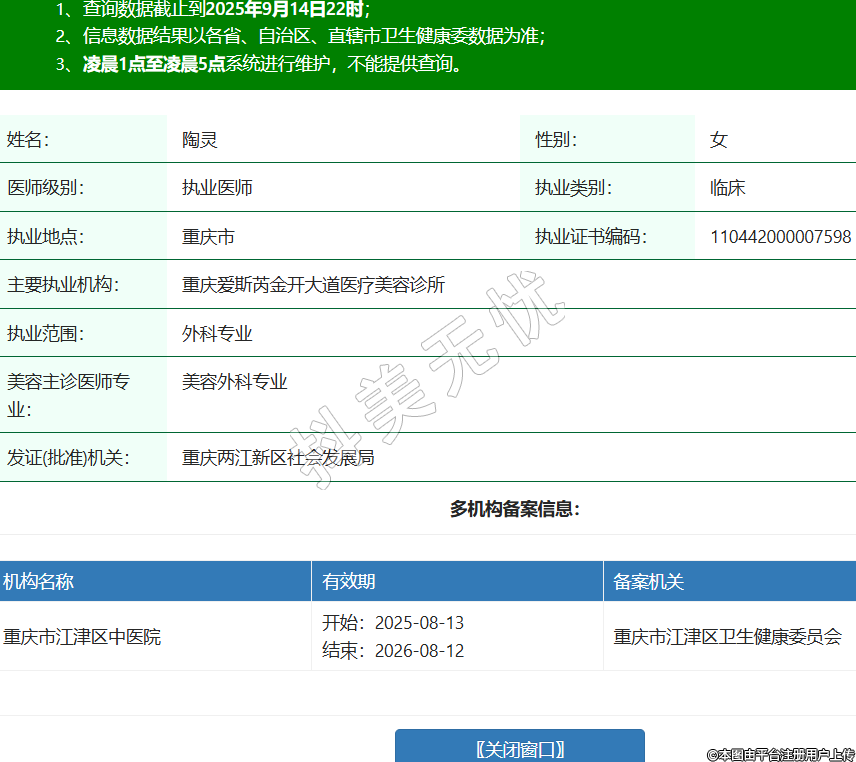 姓名:陶靈性別:女醫(yī)師級別:執(zhí)業(yè)醫(yī)師執(zhí)業(yè)類別:臨床執(zhí)業(yè)地點(diǎn):重慶市執(zhí)業(yè)證書編碼:110442000007598主要執(zhí)業(yè)機(jī)構(gòu):重慶愛斯芮金開大道醫(yī)療美容診所執(zhí)業(yè)范圍:外科專業(yè)美容主診醫(yī)師專業(yè):美容外科專業(yè)發(fā)證(批準(zhǔn))機(jī)關(guān):重慶兩江新區(qū)社會發(fā)展局多機(jī)構(gòu)備案信息:機(jī)構(gòu)名稱 有效期 備案機(jī)關(guān) 重慶市江津區(qū)中醫(yī)院 開始:2025-08-13結(jié)束:2026-08-12重慶市江津區(qū)衛(wèi)生健康委員會 -