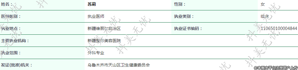 醫(yī)師執(zhí)業(yè)編碼:110650100004844,畢業(yè)于新疆石河子大學(xué)臨床醫(yī)學(xué)系。