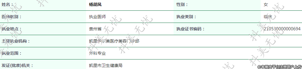 現(xiàn)任凱里伊爾美醫(yī)療美容門診部執(zhí)業(yè)醫(yī)師。