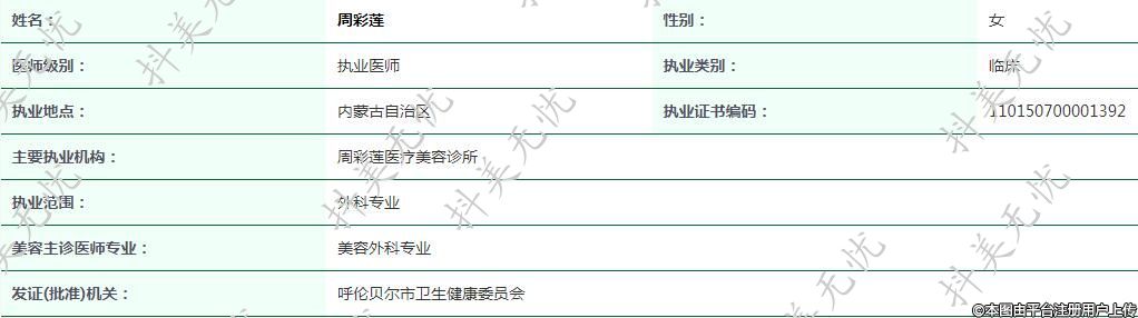 主要執(zhí)業(yè)機(jī)構(gòu):周彩蓮醫(yī)療美容診所