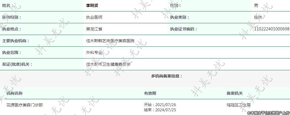 主要執(zhí)業(yè)機(jī)構(gòu):佳木斯韓藝來(lái)醫(yī)療美容醫(yī)院