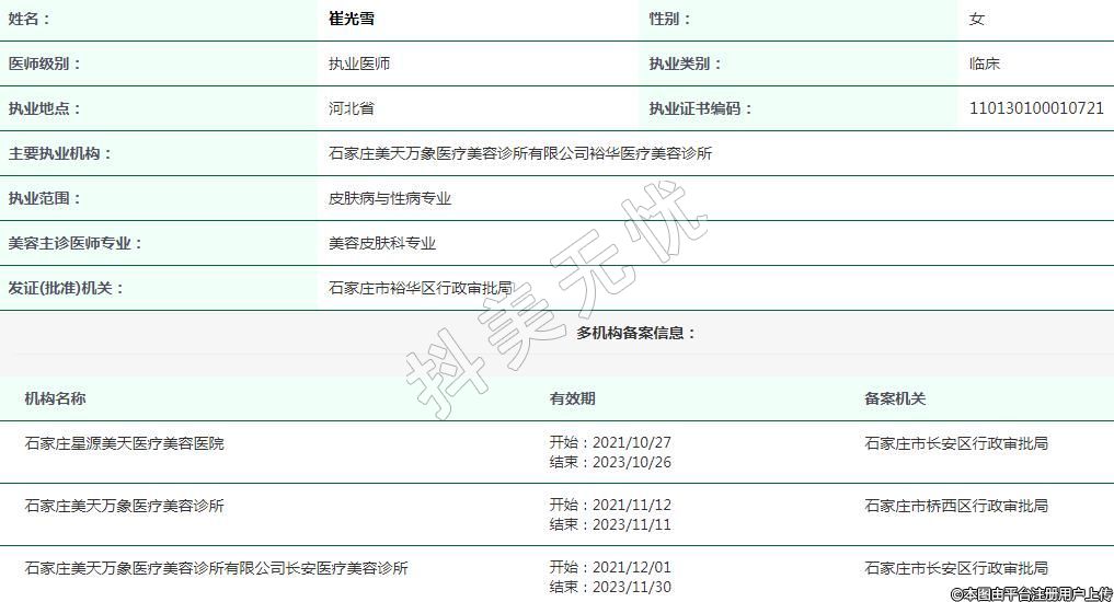 主要執(zhí)業(yè)機構:石家莊美天萬象醫(yī)療美容診所有限公司裕華醫(yī)療美容診所