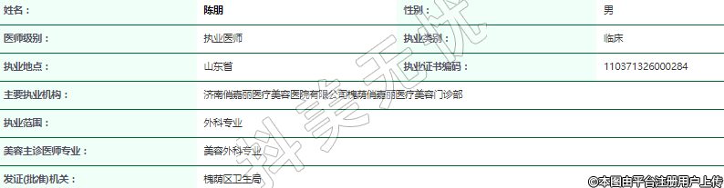 主要執(zhí)業(yè)機構(gòu):濟南俏嘉麗醫(yī)療美容醫(yī)院有限公司槐蔭俏嘉麗醫(yī)療美容門診部