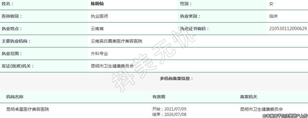 主要執(zhí)業(yè)機(jī)構(gòu):云南吳氏嘉美醫(yī)療美容醫(yī)院