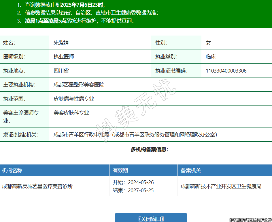 姓名:朱紫婷性別:女醫(yī)師級別:執(zhí)業(yè)醫(yī)師執(zhí)業(yè)類別:臨床執(zhí)業(yè)地點:四川省執(zhí)業(yè)證書編碼:110330400003306主要執(zhí)業(yè)機構:成都藝星整形美容醫(yī)院執(zhí)業(yè)范圍:皮膚病與性病專業(yè)美容主診醫(yī)師專業(yè):美容皮膚科專業(yè)發(fā)證(批準)機關:成都市青羊區(qū)行政審批局(成都市青羊區(qū)政務服務管理和網(wǎng)絡理政辦公室)多機構備案信息:機構名稱 有效期 備案機關 成都高新復城藝星醫(yī)療美容診所 開始:2024-05-26結束:2027-05-25成都高新技術產(chǎn)業(yè)開發(fā)區(qū)衛(wèi)生健康局 -