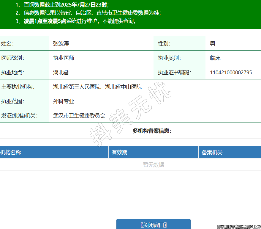 姓名:張波濤性別:男醫(yī)師級別:執(zhí)業(yè)醫(yī)師執(zhí)業(yè)類別:臨床執(zhí)業(yè)地點:湖北省執(zhí)業(yè)證書編碼:110421000002795主要執(zhí)業(yè)機構(gòu):湖北省第三人民醫(yī)院、湖北省中山醫(yī)院執(zhí)業(yè)范圍:外科專業(yè)發(fā)證(批準)機關(guān):武漢市衛(wèi)生健康委員會 -