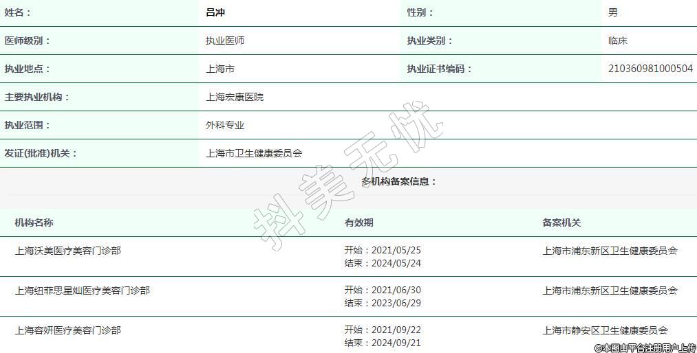 上海宏康醫(yī)院醫(yī)療美容執(zhí)業(yè)醫(yī)師