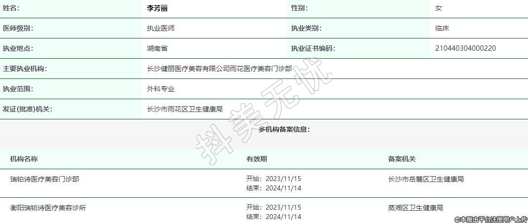 主要執(zhí)業(yè)機(jī)構(gòu):長(zhǎng)沙健麗醫(yī)療美容有限公司雨花醫(yī)療美容門診部