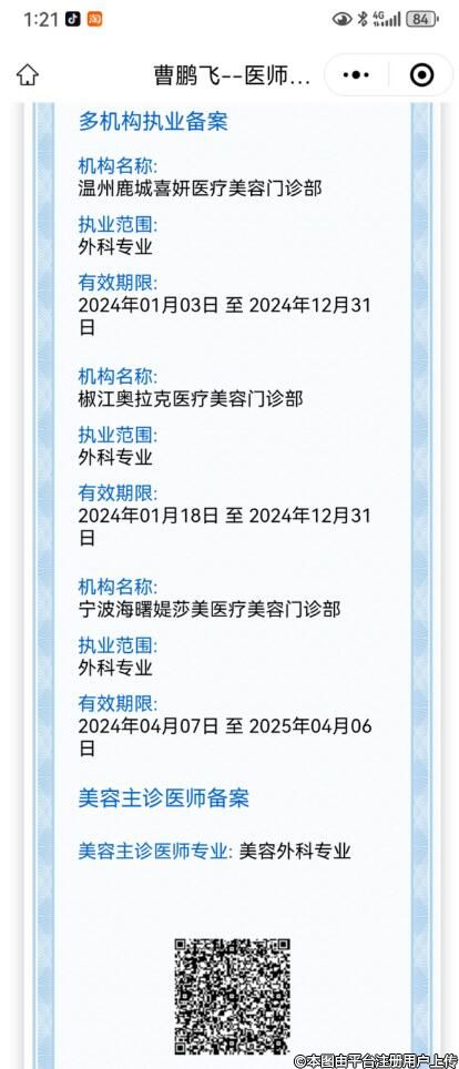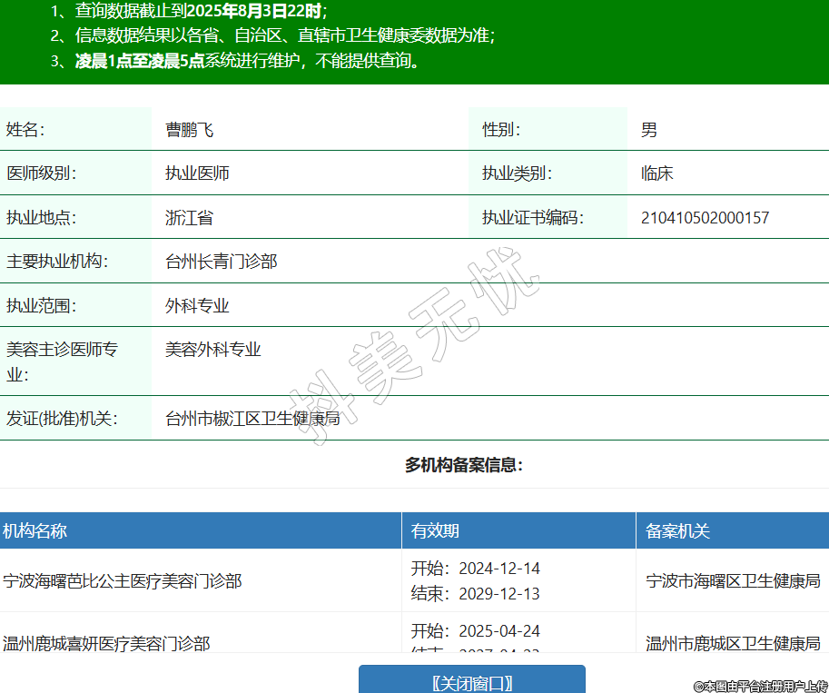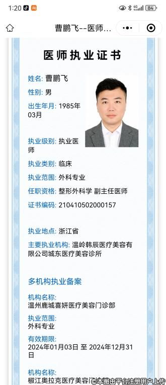 姓名:曹鵬飛性別:男醫(yī)師級(jí)別:執(zhí)業(yè)醫(yī)師執(zhí)業(yè)類別:臨床執(zhí)業(yè)地點(diǎn):浙江省執(zhí)業(yè)證書編碼:210410502000157主要執(zhí)業(yè)機(jī)構(gòu):臺(tái)州長(zhǎng)青門診部執(zhí)業(yè)范圍:外科專業(yè)美容主診醫(yī)師專業(yè):美容外科專業(yè)發(fā)證(批準(zhǔn))機(jī)關(guān):臺(tái)州市椒江區(qū)衛(wèi)生健康局多機(jī)構(gòu)備案信息:機(jī)構(gòu)名稱 有效期 備案機(jī)關(guān) 寧波海曙芭比公主醫(yī)療美容門診部 開始:2024-12-14結(jié)束:2029-12-13寧波市海曙區(qū)衛(wèi)生健康局 溫州鹿城喜妍醫(yī)療美容門診部 開始:2025-04-24結(jié)束:2027-04-23溫州市鹿城區(qū)衛(wèi)生健康局 溫州甌海星耀美辰整形外科門診部 開始:2025-05-10結(jié)束:2027-05-08溫州市甌海區(qū)衛(wèi)生健康局 椒江華錦醫(yī)療美容門診部 開始:2025-07-09結(jié)束:2027-07-08臺(tái)州市椒江區(qū)衛(wèi)生健康局 溫州鹿城芭媞芭媞醫(yī)療美容診所 開始:2025-07-31結(jié)束:2026-07-30溫州市鹿城區(qū)衛(wèi)生健康局 -
