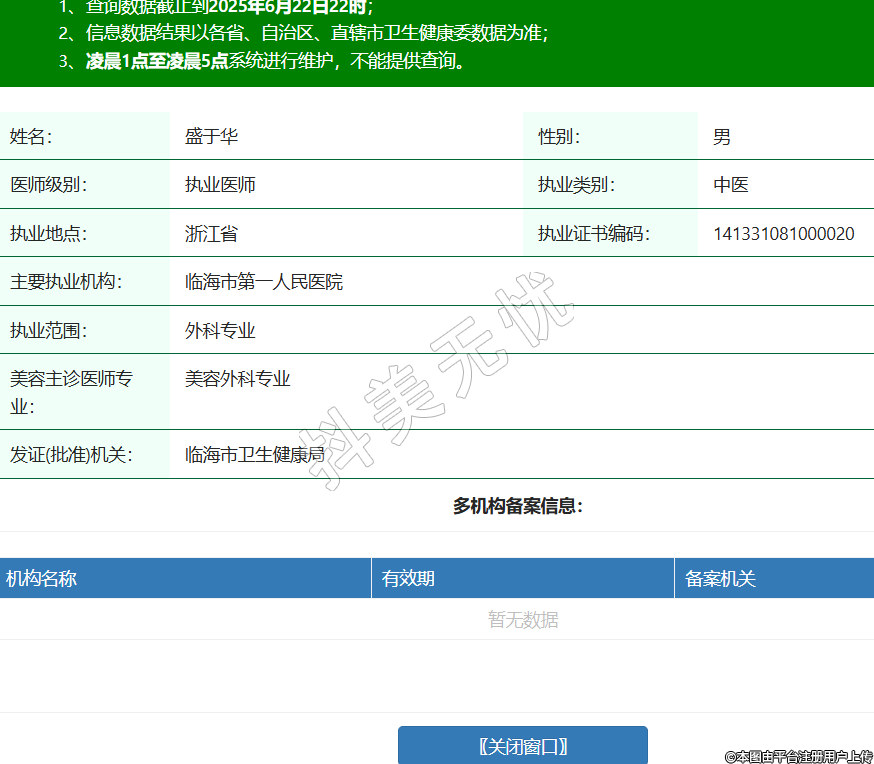 姓名:盛于華性別:男醫(yī)師級別:執(zhí)業(yè)醫(yī)師執(zhí)業(yè)類別:中醫(yī)執(zhí)業(yè)地點:浙江省執(zhí)業(yè)證書編碼:141331081000020主要執(zhí)業(yè)機構(gòu):臨海市第一人民醫(yī)院執(zhí)業(yè)范圍:外科專業(yè)美容主診醫(yī)師專業(yè):美容外科專業(yè)發(fā)證(批準)機關(guān):臨海市衛(wèi)生健康局 -