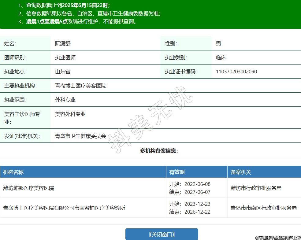 姓名:阮瀟舒性別:男醫(yī)師級別:執(zhí)業(yè)醫(yī)師執(zhí)業(yè)類別:臨床執(zhí)業(yè)地點:山東省執(zhí)業(yè)證書編碼:110370203002090主要執(zhí)業(yè)機構(gòu):青島博士醫(yī)療美容醫(yī)院執(zhí)業(yè)范圍:外科專業(yè)美容主診醫(yī)師專業(yè):美容外科專業(yè)發(fā)證(批準)機關(guān):青島市衛(wèi)生健康委員會多機構(gòu)備案信息:機構(gòu)名稱 有效期 備案機關(guān) 濰坊坤娜醫(yī)療美容醫(yī)院 開始:2022-06-08結(jié)束:2027-06-07濰坊市行政審批服務局 青島博士醫(yī)療美容醫(yī)院有限公司市南蜜柚醫(yī)療美容診所 開始:2023-12-23結(jié)束:2026-12-22青島市市南區(qū)行政審批服務局 -