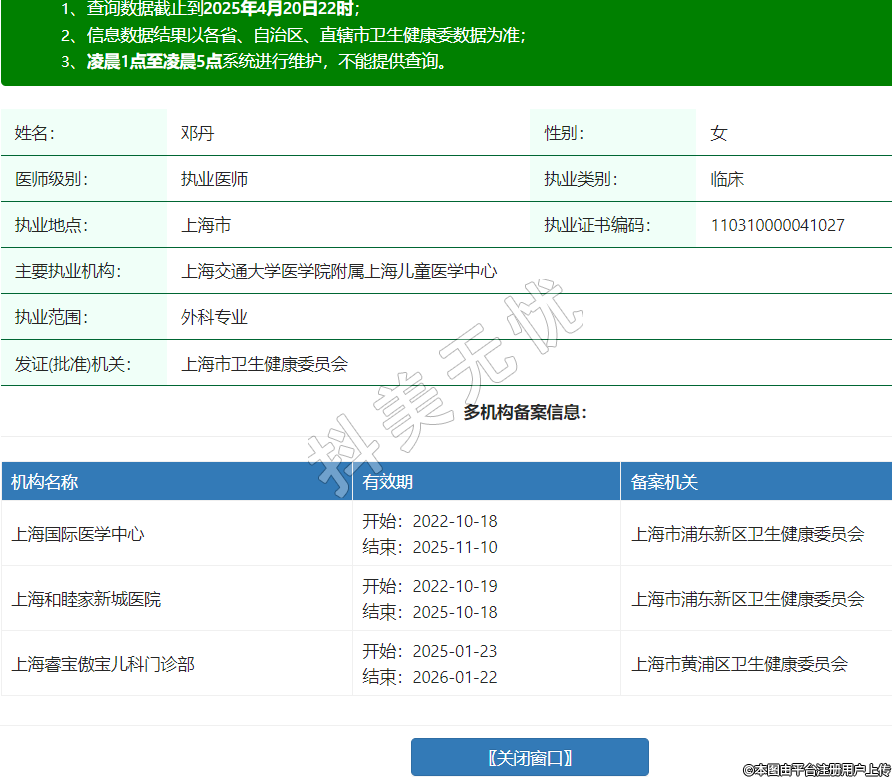 姓名:鄧丹性別:女醫(yī)師級別:執(zhí)業(yè)醫(yī)師執(zhí)業(yè)類別:臨床執(zhí)業(yè)地點:上海市執(zhí)業(yè)證書編碼:110310000041027主要執(zhí)業(yè)機構(gòu):上海交通大學(xué)醫(yī)學(xué)院附屬上海兒童醫(yī)學(xué)中心執(zhí)業(yè)范圍:外科專業(yè)發(fā)證(批準)機關(guān):上海市衛(wèi)生健康委員會多機構(gòu)備案信息:機構(gòu)名稱 有效期 備案機關(guān) 上海國際醫(yī)學(xué)中心 開始:2022-10-18結(jié)束:2025-11-10上海市浦東新區(qū)衛(wèi)生健康委員會 上海和睦家新城醫(yī)院 開始:2022-10-19結(jié)束:2025-10-18上海市浦東新區(qū)衛(wèi)生健康委員會 上海睿寶傲寶兒科門診部 開始:2025-01-23結(jié)束:2026-01-22上海市黃浦區(qū)衛(wèi)生健康委員會 -