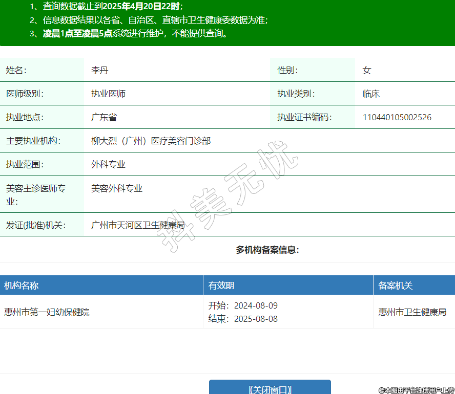 姓名:李丹性別:女醫(yī)師級別:執(zhí)業(yè)醫(yī)師執(zhí)業(yè)類別:臨床廣東省執(zhí)業(yè)證書編碼:110440105002526主要執(zhí)業(yè)機(jī)構(gòu):柳大烈(廣州)醫(yī)療美容門診部執(zhí)業(yè)范圍:外科專業(yè)美容主診醫(yī)師專業(yè):美容外科專業(yè)發(fā)證(批準(zhǔn))機(jī)關(guān):廣州市天河區(qū)衛(wèi)生健康局多機(jī)構(gòu)備案信息:機(jī)構(gòu)名稱 有效期 備案機(jī)關(guān) 惠州市第一婦幼保健院 開始:2024-08-09結(jié)束:2025-08-08惠州市衛(wèi)生健康局 -