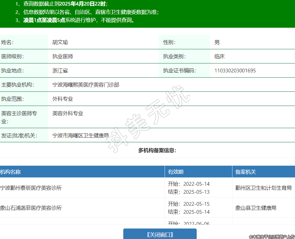 姓名:胡文瑜性別:男醫(yī)師級別:執(zhí)業(yè)醫(yī)師執(zhí)業(yè)類別:臨床執(zhí)業(yè)地點:浙江省執(zhí)業(yè)證書編碼:110330203001695主要執(zhí)業(yè)機構(gòu):寧波海曙熙美醫(yī)療美容門診部執(zhí)業(yè)范圍:外科專業(yè)美容主診醫(yī)師專業(yè):美容外科專業(yè)發(fā)證(批準(zhǔn))機關(guān):寧波市海曙區(qū)衛(wèi)生健康局多機構(gòu)備案信息:機構(gòu)名稱 有效期 備案機關(guān) 寧波鄞州春辰醫(yī)療美容診所 開始:2022-05-14結(jié)束:2025-05-13鄞州區(qū)衛(wèi)生和計劃生育局 象山石浦菡菲醫(yī)療美容診所 開始:2022-05-15結(jié)束:2025-05-14象山縣衛(wèi)生健康局 衢州市柯城區(qū)桂美人醫(yī)療美容門診部(普通合伙) 開始:2022-06-06結(jié)束:2027-06-05衢州市柯城區(qū)衛(wèi)生健康局 寧波江北尚麗醫(yī)療美容門診部 開始:2023-08-31結(jié)束:2026-08-31寧波市江北區(qū)衛(wèi)生健康局 桐廬韓加醫(yī)療美容門診部 開始:2024-03-06結(jié)束:2027-03-04桐廬縣衛(wèi)生健康局 寧波江北外灘纖姿醫(yī)療美容門診部 開始:2024-05-21結(jié)束:2027-06-20寧波市江北區(qū)衛(wèi)生健康局 嘉興畫美醫(yī)療美容診所 開始:2024-12-02結(jié)束:2027-12-01嘉興市南湖區(qū)衛(wèi)生健康局 寧波海曙初美星范醫(yī)療美容門診部 開始:2025-04-09結(jié)束:2028-04-08寧波市海曙區(qū)衛(wèi)生健康局 -