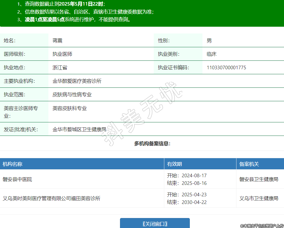 姓名:蔣震性別:男醫(yī)師級(jí)別:執(zhí)業(yè)醫(yī)師執(zhí)業(yè)類(lèi)別:臨床執(zhí)業(yè)地點(diǎn):浙江省執(zhí)業(yè)證書(shū)編碼:110330700001775主要執(zhí)業(yè)機(jī)構(gòu):金華醉愛(ài)醫(yī)療美容診所執(zhí)業(yè)范圍:皮膚病與性病專(zhuān)業(yè)美容主診醫(yī)師專(zhuān)業(yè):美容皮膚科專(zhuān)業(yè)發(fā)證(批準(zhǔn))機(jī)關(guān):金華市婺城區(qū)衛(wèi)生健康局多機(jī)構(gòu)備案信息:機(jī)構(gòu)名稱(chēng) 有效期 備案機(jī)關(guān) 磐安縣中醫(yī)院 開(kāi)始:2024-08-17結(jié)束:2025-08-16磐安縣衛(wèi)生健康局 義烏美時(shí)美刻醫(yī)療管理有限公司福田美容診所 開(kāi)始:2025-04-23結(jié)束:2030-04-22義烏市衛(wèi)生健康局 -