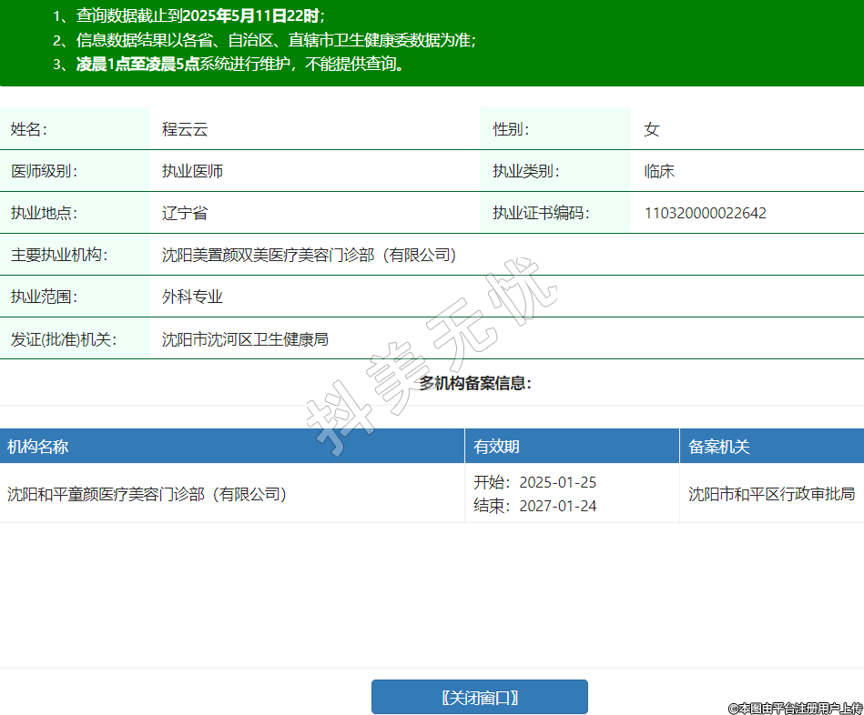 姓名:程云云性別:女醫(yī)師級別:執(zhí)業(yè)醫(yī)師執(zhí)業(yè)類別:臨床執(zhí)業(yè)地點:遼寧省執(zhí)業(yè)證書編碼:110320000022642主要執(zhí)業(yè)機構:沈陽美置顏雙美醫(yī)療美容門診部(有限公司)執(zhí)業(yè)范圍:外科專業(yè)發(fā)證(批準)機關:沈陽市沈河區(qū)衛(wèi)生健康局多機構備案信息:機構名稱 有效期 備案機關 沈陽和平童顏醫(yī)療美容門診部(有限公司) 開始:2025-01-25結束:2027-01-24沈陽市和平區(qū)行政審批局 -