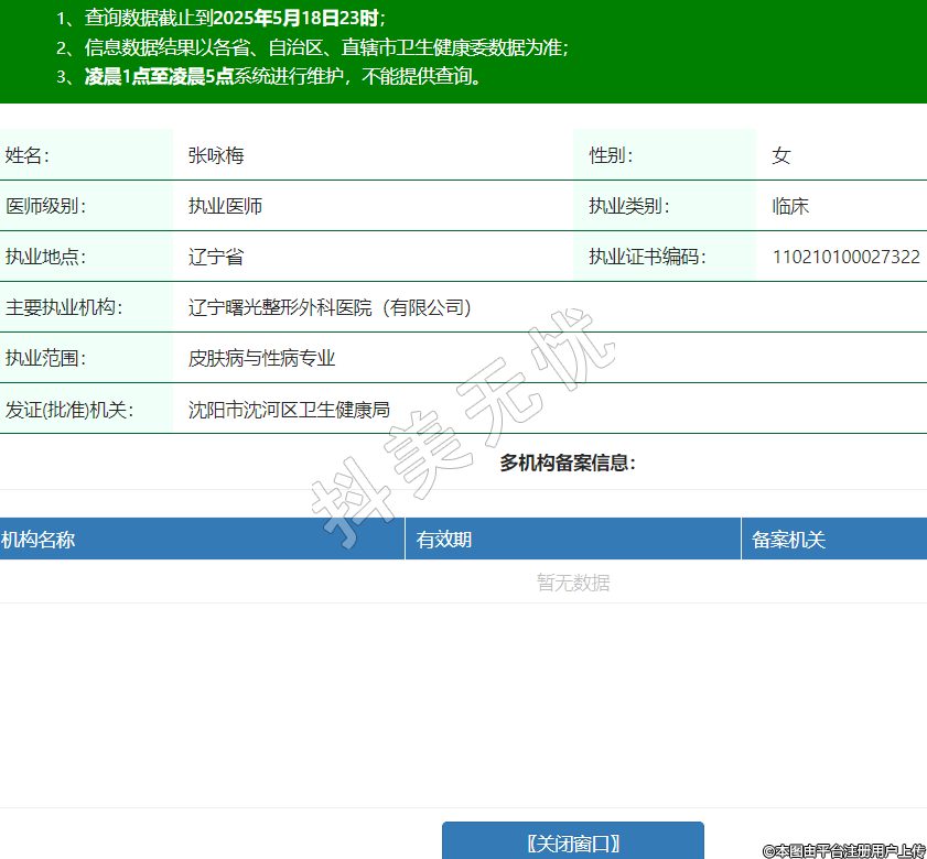 姓名:張詠梅性別:女醫(yī)師級別:執(zhí)業(yè)醫(yī)師執(zhí)業(yè)類別:臨床執(zhí)業(yè)地點:遼寧省執(zhí)業(yè)證書編碼:110210100027322主要執(zhí)業(yè)機構:遼寧曙光整形外科醫(yī)院(有限公司)執(zhí)業(yè)范圍:皮膚病與性病專業(yè)發(fā)證(批準)機關:沈陽市沈河區(qū)衛(wèi)生健康局 -